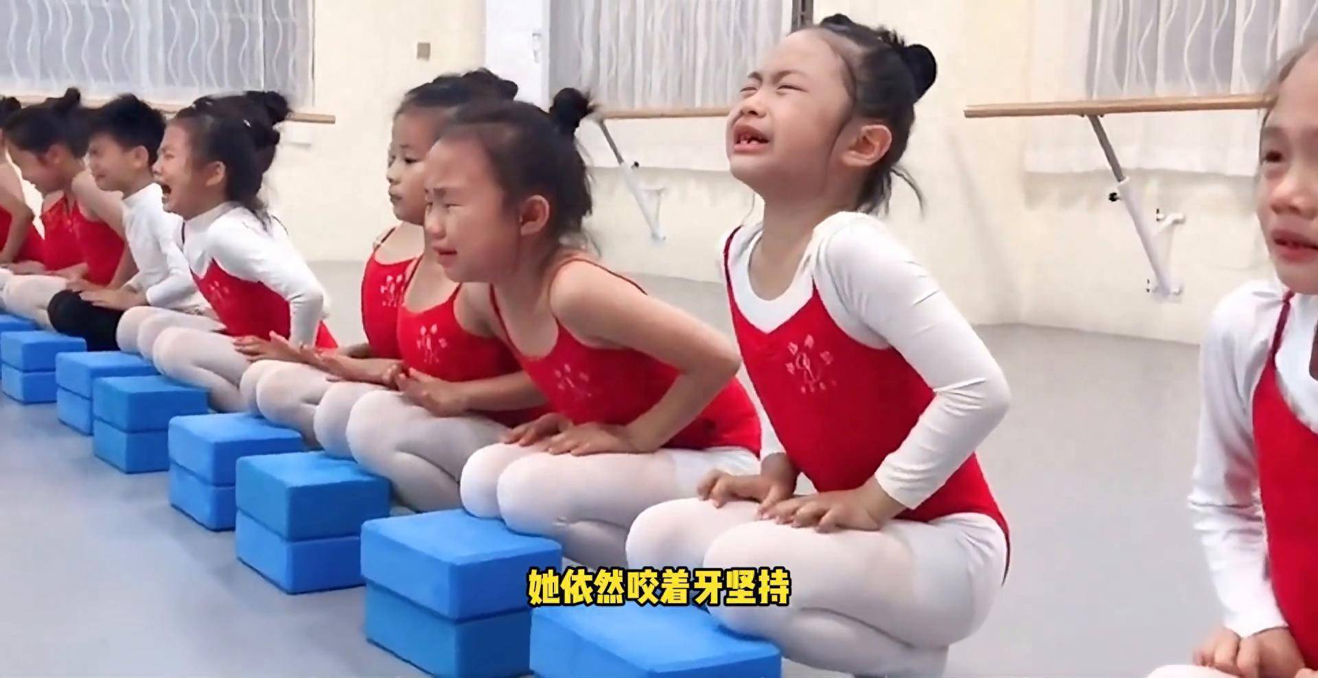 小姑娘终于忍不住趴在地上呜呜的哭了起来,可即便是疼的直掉眼泪,她也没有举手叫停,她只是紧紧咬着牙,小脸憋得通红,硬是撑到了老师喊结束的那一刻。